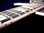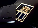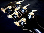 実際の作業はかなり困難を極めました。当時のカスタムは指板材やジョイントの接着はかなり強固でアイロンを当てる程度ではビクともせず、苦心惨憺しました。フロイド搭載に関してもナット幅が合わずヘッドの首部分の形状を細くしセルも巻き直し、ネック仕込み角を変えると言う大工事が伴いました。バック面をアーチ化する事でヒール部の厚みを薄くし、ヒールレスカット等の様に外観を変えてしまう事なくハイポジションの握りを安定させました。当時のジョイントは、フロントP.Uまで届いていない短いものであったのでディープジョイントの仕込みにも変えています。ギターの軸となるスケール(弦長)をフェンダースケール648mmに変更するため、ネックジョイント部の延長、カスタムセルを多く巻いた指板材の再製作と言った作業も行っています。エスカッションはブラスの削り出しで、スイッチプレート等もクロームメッキ処理を行っています。 |