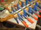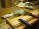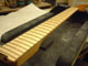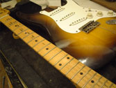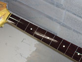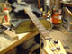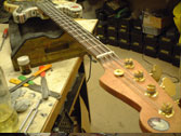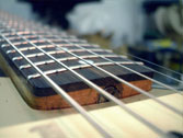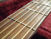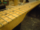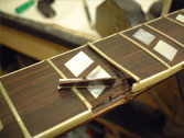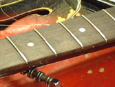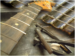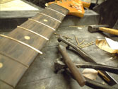 フレットは常に弦との摩擦が起こるため消耗します。消耗してしまうとビビリや音詰まり、ピッチの狂いも起こり演奏上にも支障が出てきます。このフレット周りに関するノウハウを深く、又幅広く対処方法をもっているのも当工房の特色です。独特の打ち込み方法やフレットの溝、足幅に対する様々な対処方、フレット形状毎に異なる仕上げ、エッジの処理を行っています。またビンテージギターにおける様々なのフレット交換方法や、スラブやラウンド指板の張り替え、ウッドバインディング指板、指板延長、フレットレス加工等も行います。指板の破損やインレイの補修、改造(別コンテンツ)も可能。すり合わせにより「フレットの面がまっ平ら」になってしまうなどと言うことは絶対にせず、例え低い状態でも頂点を必ずしっかり出す処置を行っています。